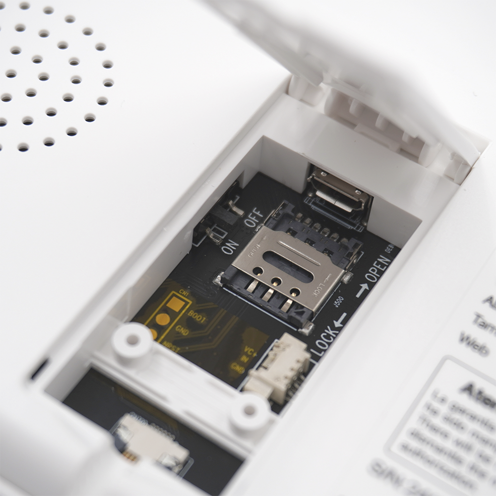 • Por SMS usando la tecnología GSM recibe notificaciones incluso sin conexión Wifi (tarjeta no incluida).