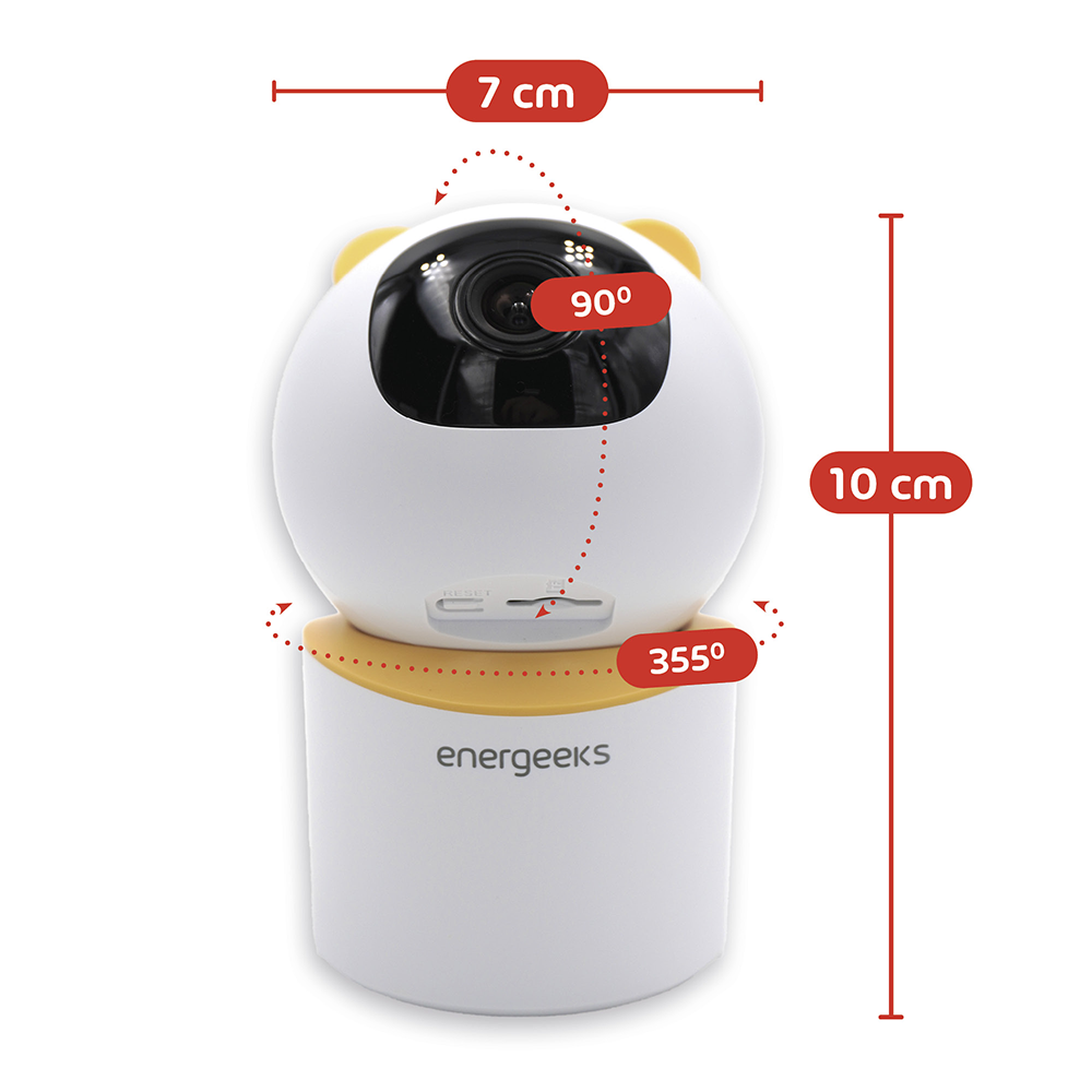 Esta cámara de vigilancia es una 2-en-1 ya que está diseñada tanto para vigilar espacios como para controlar que todo con tu bebé esté en orden sin tener que moverte. La cámara detecta movimientos (filtro humano), llantos (sonidos), detecta cambios de temperatura o humedad. Al ser parte del ecosistema de Energeeks puedes hacer que tu smarthome adapte la temperatura de la habitación ya sea con aire acondicionado conectado con el dispositivo IR de Energeeks, se encienda, o que las válvulas termostáticas de radiadores y el termostáto ajusten la temperatura de una habitación.